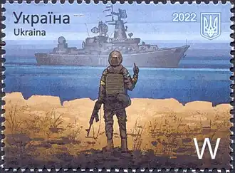 - ↑ « Ukrainian soldiers who told Russian warship 'go f*** yourself' honoured on postal stamps », itv.com, (lire en ligne [archive du ], consulté le ).