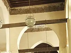 L’un des éléments artistiques de la mosquée sont les inscriptions coraniques réalisées en écriture coufique fleurie – de nombreuses inscriptions sont préservées tandis que d’autres sont perdues. Parmi celles perdues, beaucoup ont été remplacées ou restaurées. En raison des restaurations successives effectuées, les styles coufiques ont évolué avec temps. On dit que la mosquée avait douze mille pieds de décoration coufique. Des inscriptions coufiques figurent sur les quatre côtés de chacune des cinq travées de la salle de prière. Les bases carrées des trois dômes et le mur de qibla (mur sud-est) sous les fenêtres portent également la bande de gypse gravées d'inscriptions coraniques. Au sommet, les colonnades des arcs de la mosquée sont ornées d'une bande de gypse d'inscriptions coufiques fleuries du Coran qui mesure en moyenne environ 52 cm de largeur[7].