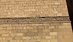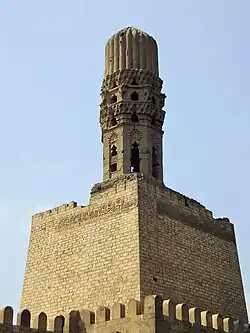Le mur extérieur du bastion sud présente une inscription en coufique feuillagé, sculptée dans le marbre, de la période fatimide[1],[2]. Le bord haut de la partie inférieure de ce bastion présente également des créneaux ornés conçus selon un motif entrelacé qui ressemble aux créneaux trouvés dans l'ancienne mosquée Ibn Tulun[6]. Le minaret nord a ensuite été incorporé dans les murs de la ville par Badr al-Jamali en 1087, date à laquelle l'inscription coufique sur son bastion enveloppant a été soit déplacée, soit regravée à l'extérieur des murs de la ville[21].