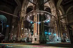 Parmi les éléments de mobilier remarquables figurent une dikka (estrade) en albâtre, portée par huit fines colonnes, un minbar en bois ouvragé et albâtre et plusieurs lustres aux dessins complexes.