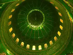 La face interne des coupoles sur les deux côtés est ornée de miroirs verts et turquoise. Le centre est occupé par des versets coraniques, et la coupole est rythmée par des arcs en dorure qui reposent sur une frise de décors géométriques. En dessous de celle-ci vient la rangée de fenêtres du tambour, puis un bandeau portant des versets du Coran en lettres dorées. La coupole centrale, sous laquelle se trouve le tombeau, reprend cette organisation, mais avec un décor plus riche: elle présente un décor floral raffiné sur un fond en bleus dégradés.