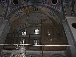 Chaque galerie se termine par une petite chapelle située respectivement au-dessus de la *proscomidie et du *diaconon. Les deux chapelles sont surmontées par un *dôme hémisphérique érigé directement sur les *pendentifs[16]. La lumière entre dans l’édifice par cinq rangées de fenêtres dont trois au niveau des galeries. Certaines fenêtres datent de la période ottomane.