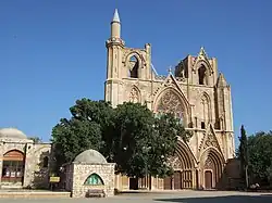 En 1570, les deux tours sont endommagées durant les bombardements des forces ottomanes, lors du Siège de Famagouste. La cathédrale devient mosquée en 1571, après la victoire ottomane. En raison de la tradition iconoclaste de l'islam sunnite, la plupart des têtes humaines et d'animaux ornant l'édifice ont été détruites[2]. Plus tard, la mosquée a été surmontée d'un minaret[5]. Depuis cette époque, et jusqu'à la prise de possession de Chypre par les Britanniques en 1878, l'entrée de l'édifice était interdite aux chrétiens[1].