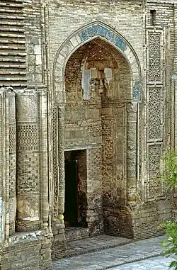 La mosquée Magoki-Attari à six colonnes est intéressante pour son portail exceptionnellement riche à la conception festive. Son arc est recouvert de petites inscriptions sculptées en terre cuite. Les angles de la niche du portail sont décorés de stalactites, regroupés sous une forme de conque. Les pylônes sont décorés de quatre contre-colonnes, recouvertes sur leur surface courbe de briques polies appariées. La niche du portail est flanquée d'une ceinture de motifs géométriques sculptés d'albâtre. L'arc en ogive qui le surmonte est soutenu de chaque côté par deux colonnes de pierre sculptées. Le portail de la mosquée reprend une système décoratif ancien dans une nouvelle version. La maçonnerie forme des rouleaux qui s'entrelacent entre eux à l'avant des pylônes[16]. Des panneaux décoratifs rectangulaires, allongés verticalement ornent la façade sud. Ils sont entourés de tresses de briques profilées. L'intérieur des panneaux est garni d'ornements géométriques clairs et en relief. Les sculptures sont fortement stylisées, presque abstraites[17].