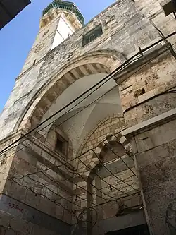 La mosquée se trouve à l'emplacement de l'ancien palais du patriarche latin. Après la reddition des croisés face à Saladin en 1187, le bâtiment est converti en mosquée. Le minaret est construit en 1417[1].
