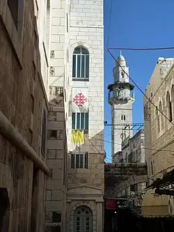 La mosquée d'Omar, située de l'autre côté de l'église du Saint-Sépulcre, possède un minaret quasi identique[2]. Les deux minarets ont été conçus ensemble : la ligne imaginaire qui les relie traverse la porte du tombeau de Jésus, et les deux minarets, situés à équidistance tombeau[2], ont la même hauteur bien que leurs bases soient sur deux niveaux différents[3]. Cormac Murphy-O'Connor affirme que les dirigeants mamelouks ont ainsi pu avoir l'intention d'« invalider le Saint-Sépulcre », car la croyance islamique affirme que Jésus n'est pas mort sur la croix mais qu'il a été élevé au ciel de son vivant par Allah[3].