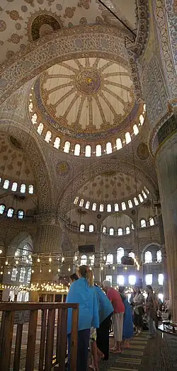 La salle de prière est surmontée d'un système ascendant de coupoles et de demi-dômes, chacun soutenu par trois exèdres, culminant avec le large dôme central, qui mesure 23,5 m de diamètre et 43 m de hauteur à son point central.