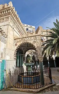 Le haut et gracieux minaret accolé à la mosquée pourrait dénoter une influence ottomane plutôt que maghrébine. Il est octogonal et couvert de faïences. La porte d'entrée sur la rue est ornée d'un remarquable travail de ciselures: rosaces, palmettes, versets du Coran en caractères koufiques. Elle fait pénétrer dans une cour intérieure en forme de croissant, entourée d'un promenoir couvert à colonnes, et ornée d'une vasque pour les ablutions en marbre blanc recouverte d'une petite coupole[6]. On peut lire cette inscription surmontant l'entrée de la salle de prière: « O vous croyant, prononcez le nom de Dieu le plus souvent possible, et louez le matin et soir. »[7]