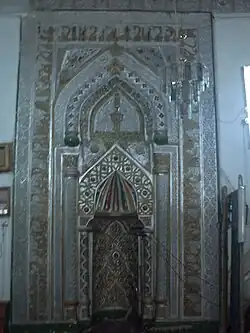 Le mihrab est situé au milieu du mur de la qiblah au niveau du couloir nord. C'est une simple cavité d'environ 85 cm de profondeur, et surmonté d'une dentelle effilée sur deux arceaux aux motifs floraux et géométriques. Le mihrab est entouré d'inscriptions coufiques qui se lisent comme suit : « Au nom de Dieu le Tout Miséricordieux le Très Miséricordieux, j'accepte votre Seigneur et je sois parmi les adorateurs et non parmi les ignorants et j'adore votre Seigneur jusqu'à ce que vous vienne la certitude. (mort)", et décoration de niche de l'intérieur et variété de décorations végétales qui comprennent des feuilles de vigne. Sur le côté du mihrab se trouve une inscription écrite en coufique d'après la sourate At-Taubah 18. Le mihrab est peint avec de la peinture chimique moderne.