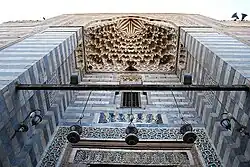 Le portail principal, ou muqarnas, est situé dans un pistaq, ou cadre rectangulaire, qui s'élève au-dessus de la façade de la mosquée[2].