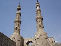 Les deux tours de la porte voisine de Bab Zuweila, situées dans le mur d'origine, ont été sauvées de la démolition et servent de base aux deux minarets restants de la mosquée, ce qui en fait une caractéristique inhabituelle et unique de ce complexe de mosquée[3].