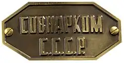 Plaque de 1930 du gouvernement soviétique portant le mot-valise Sovnarkom.