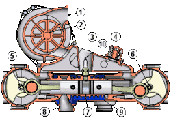 - vilebrequin d'admission (incliné d'environ 20° par rapport à l'autre vilebrequin, de façon à créer un déphasage)