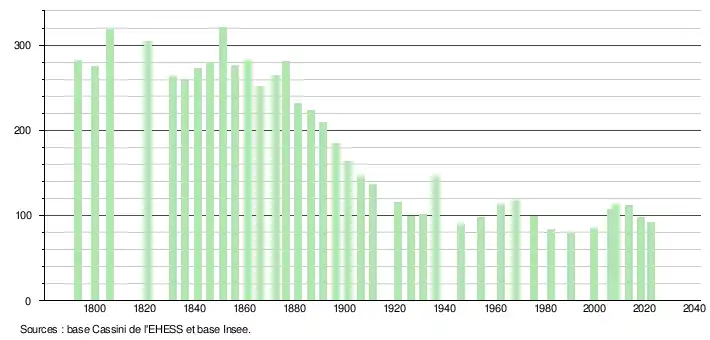 L'évolution du nombre d'habitants est connue à travers les recensements de la population effectués dans la commune depuis 1793. Pour les communes de moins de 10 000 habitants, une enquête de recensement portant sur toute la population est réalisée tous les cinq ans, les populations de référence des années intermédiaires étant quant à elles estimées par interpolation ou extrapolation[20]. Pour la commune, le premier recensement exhaustif entrant dans le cadre du nouveau dispositif a été réalisé en 2008[21].