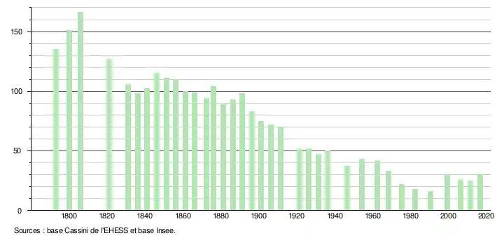 L'évolution du nombre d'habitants est connue à travers les recensements de la population effectués dans la commune depuis 1793. Pour les communes de moins de 10 000 habitants, une enquête de recensement portant sur toute la population est réalisée tous les cinq ans, les populations de référence des années intermédiaires étant quant à elles estimées par interpolation ou extrapolation[5]. Pour la commune, le premier recensement exhaustif entrant dans le cadre du nouveau dispositif a été réalisé en 2006[6].