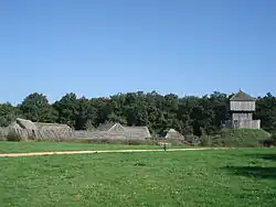 La motte dominant sa basse-cour comprenant un logis seigneurial, un logis des chevaliers et des bâtiments agricoles. Site de Saint-Sylvain-d'Anjou, reconstitution d'une motte du XIe siècle.