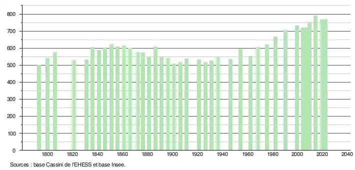 L'évolution du nombre d'habitants est connue à travers les recensements de la population effectués dans la commune depuis 1793. Pour les communes de moins de 10 000 habitants, une enquête de recensement portant sur toute la population est réalisée tous les cinq ans, les populations de référence des années intermédiaires étant quant à elles estimées par interpolation ou extrapolation[24]. Pour la commune, le premier recensement exhaustif entrant dans le cadre du nouveau dispositif a été réalisé en 2004[25].