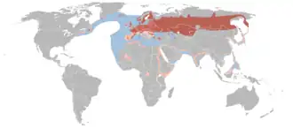 Rouge : Aire de nidification (et de résidence sur l'Europe occidentale) / Rose : Aire d'hivernage / Bleu : espace maritime d'hivernage