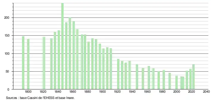 L'évolution du nombre d'habitants est connue à travers les recensements de la population effectués dans la commune depuis 1793. Pour les communes de moins de 10 000 habitants, une enquête de recensement portant sur toute la population est réalisée tous les cinq ans, les populations de référence des années intermédiaires étant quant à elles estimées par interpolation ou extrapolation[33]. Pour la commune, le premier recensement exhaustif entrant dans le cadre du nouveau dispositif a été réalisé en 2008[34].