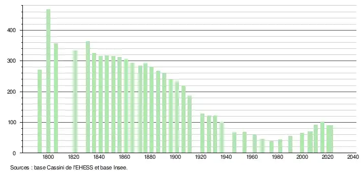 L'évolution du nombre d'habitants est connue à travers les recensements de la population effectués dans la commune depuis 1793. Pour les communes de moins de 10 000 habitants, une enquête de recensement portant sur toute la population est réalisée tous les cinq ans, les populations de référence des années intermédiaires étant quant à elles estimées par interpolation ou extrapolation[32]. Pour la commune, le premier recensement exhaustif entrant dans le cadre du nouveau dispositif a été réalisé en 2005[33].