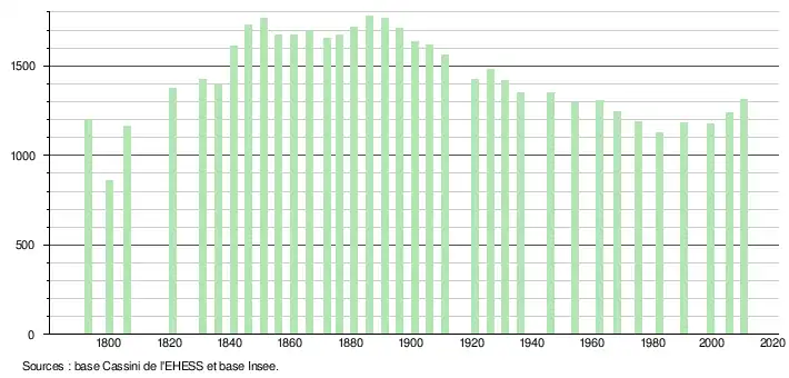 L'évolution du nombre d'habitants est connue à travers les recensements de la population effectués dans la commune depuis 1793. À partir du , les populations légales des communes sont publiées annuellement dans le cadre d'un recensement qui repose désormais sur une collecte d'information annuelle, concernant successivement tous les territoires communaux au cours d'une période de cinq ans. Pour les communes de moins de 10 000 habitants, une enquête de recensement portant sur toute la population est réalisée tous les cinq ans, les populations légales des années intermédiaires étant quant à elles estimées par interpolation ou extrapolation[10]. Pour la commune, le premier recensement exhaustif entrant dans le cadre du nouveau dispositif a été réalisé en 2005[11],[Note 2].