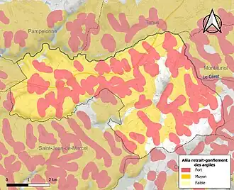 La commune est vulnérable au risque de mouvements de terrains constitué principalement du retrait-gonflement des sols argileux[21]. Cet aléa est susceptible d'engendrer des dommages importants aux bâtiments en cas d’alternance de périodes de sécheresse et de pluie. 89 % de la superficie communale est en aléa moyen ou fort (76,3 % au niveau départemental et 48,5 % au niveau national). Sur les 166 bâtiments dénombrés sur la commune en 2019, 162 sont en aléa moyen ou fort, soit 98 %, à comparer aux 90 % au niveau départemental et 54 % au niveau national. Une cartographie de l'exposition du territoire national au retrait gonflement des sols argileux est disponible sur le site du BRGM[22],[Carte 3].