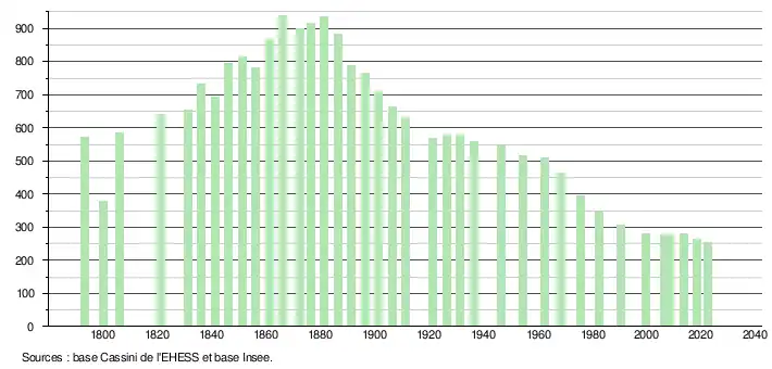 | L'évolution du nombre d'habitants est connue à travers les recensements de la population effectués dans la commune depuis 1793. Pour les communes de moins de 10 000 habitants, une enquête de recensement portant sur toute la population est réalisée tous les cinq ans, les populations de référence des années intermédiaires étant quant à elles estimées par interpolation ou extrapolation[27]. Pour la commune, le premier recensement exhaustif entrant dans le cadre du nouveau dispositif a été réalisé en 2008[28]. En 2022, la commune comptait 255 habitants[Note 4], en évolution de −8,93 % par rapport à 2016 (Tarn : +2,52 %, France hors Mayotte : +2,11 %). |