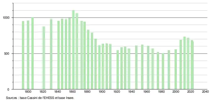 L'évolution du nombre d'habitants est connue à travers les recensements de la population effectués dans la commune depuis 1793. Pour les communes de moins de 10 000 habitants, une enquête de recensement portant sur toute la population est réalisée tous les cinq ans, les populations de référence des années intermédiaires étant quant à elles estimées par interpolation ou extrapolation[38]. Pour la commune, le premier recensement exhaustif entrant dans le cadre du nouveau dispositif a été réalisé en 2006[39].