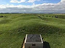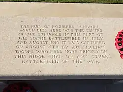 « Les ruines du moulin à vent de Pozières qui sont étendues ici étaient le centre des combats dans cette partie du champ de bataille de la Somme en juillet et août 1916. Elles ont été capturées le 4 août par les troupes australiennes qui sont tombées sur cette crête en plus grand nombre que sur n'importe quel autre champ de bataille de la guerre[4]. »