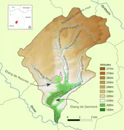Au XIIIe siècle[11], des travaux menés par des moines bénédictins ont permis d'aménager un étang artificiel à l'aide de digues et de canaux en s'adaptant aux formations naturelles et géologiques. La digue du moulin a fermé le passage de sortie de la dépression et mené à une surélévation de la hauteur d'eau. L'étang s'étendait au début du XIXe siècle sur près de 43 hectares et il captait l'eau du ruisseau de Rosa[12] ainsi qu'une partie de celle du bassin versant du ru du moulin de Darmont[13]. Le surplus rejoignait en contrebas le ruisseau du moulin de Darmont[14], puis l'Orne, un affluent de la Moselle et un sous-affluent du Rhin. Parallèlement, un second étang de plus petite taille a été aménagé par le détournement de l'eau du ruisseau de Rosa.