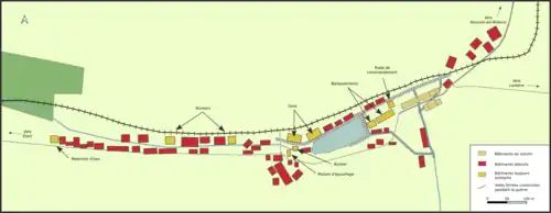 L'armée allemande aménage une base desservie par un chemin empierré, une voie ferrée de 0,60 mètre, l’eau sous pression, l'électricité, le téléphone. Sur une longueur de 700 mètres, les officiers font construire, en bois, en torchis, en briques et en matériaux préfabriqués, des baraquements, des chalets en bois, des installations sanitaires, des douches et un kiosque à musique[33]. L'ancien lavoir est transformé en écurie et un appentis, qui sera détruit après la guerre, est construit dans le prolongement du moulin. Le bâtiment principal est réaménagé. Un circuit est installé à l'intérieur afin de s'occuper des soldats de retour du front. Les sous-sols du bâtiment sont aménagés et servent d’entrepôt, de cuisine et d'infirmerie. Dans les étages, des dortoirs hébergent les soldats et les blessés. Les officiers bénéficient quant à eux d'un bâtiment construit directement sur la digue[32].