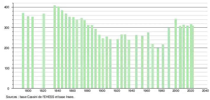 L'évolution du nombre d'habitants est connue à travers les recensements de la population effectués dans la commune depuis 1793. Pour les communes de moins de 10 000 habitants, une enquête de recensement portant sur toute la population est réalisée tous les cinq ans, les populations de référence des années intermédiaires étant quant à elles estimées par interpolation ou extrapolation[29]. Pour la commune, le premier recensement exhaustif entrant dans le cadre du nouveau dispositif a été réalisé en 2005[30].