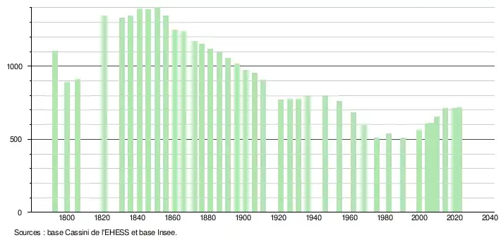 L'évolution du nombre d'habitants est connue à travers les recensements de la population effectués dans la commune depuis 1793. Pour les communes de moins de 10 000 habitants, une enquête de recensement portant sur toute la population est réalisée tous les cinq ans, les populations de référence des années intermédiaires étant quant à elles estimées par interpolation ou extrapolation[25]. Pour la commune, le premier recensement exhaustif entrant dans le cadre du nouveau dispositif a été réalisé en 2004[26].