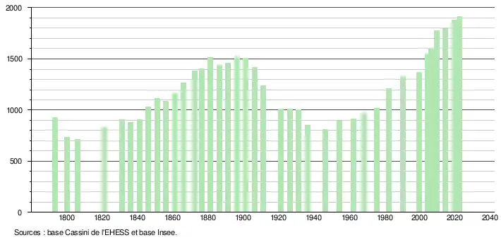 L'évolution du nombre d'habitants est connue à travers les recensements de la population effectués dans la commune depuis 1793. Pour les communes de moins de 10 000 habitants, une enquête de recensement portant sur toute la population est réalisée tous les cinq ans, les populations de référence des années intermédiaires étant quant à elles estimées par interpolation ou extrapolation[27]. Pour la commune, le premier recensement exhaustif entrant dans le cadre du nouveau dispositif a été réalisé en 2004[28].