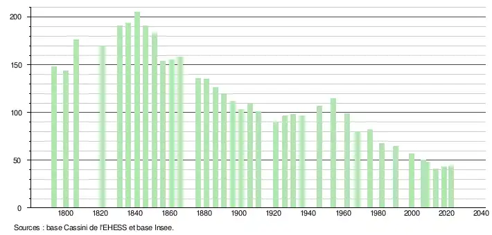 | L'évolution du nombre d'habitants est connue à travers les recensements de la population effectués dans la commune depuis 1793. Pour les communes de moins de 10 000 habitants, une enquête de recensement portant sur toute la population est réalisée tous les cinq ans, les populations de référence des années intermédiaires étant quant à elles estimées par interpolation ou extrapolation[25]. Pour la commune, le premier recensement exhaustif entrant dans le cadre du nouveau dispositif a été réalisé en 2008[26]. En 2022, la commune comptait 44 habitants[Note 4], en évolution de +7,32 % par rapport à 2016 (Hautes-Pyrénées : +1,59 %, France hors Mayotte : +2,11 %). |
