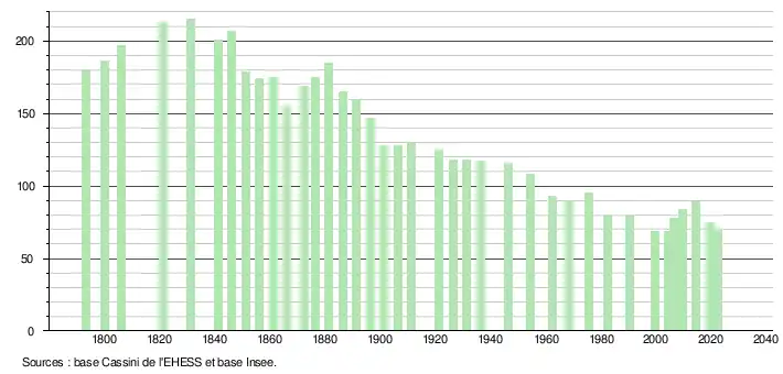 L'évolution du nombre d'habitants est connue à travers les recensements de la population effectués dans la commune depuis 1793. Pour les communes de moins de 10 000 habitants, une enquête de recensement portant sur toute la population est réalisée tous les cinq ans, les populations de référence des années intermédiaires étant quant à elles estimées par interpolation ou extrapolation[27]. Pour la commune, le premier recensement exhaustif entrant dans le cadre du nouveau dispositif a été réalisé en 2004[28].