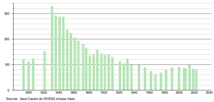 L'évolution du nombre d'habitants est connue à travers les recensements de la population effectués dans la commune depuis 1793. Pour les communes de moins de 10 000 habitants, une enquête de recensement portant sur toute la population est réalisée tous les cinq ans, les populations de référence des années intermédiaires étant quant à elles estimées par interpolation ou extrapolation[16]. Pour la commune, le premier recensement exhaustif entrant dans le cadre du nouveau dispositif a été réalisé en 2008[17].