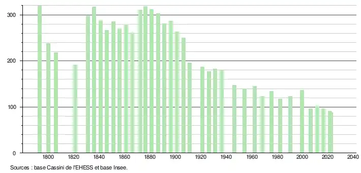 L'évolution du nombre d'habitants est connue à travers les recensements de la population effectués dans la commune depuis 1793. Pour les communes de moins de 10 000 habitants, une enquête de recensement portant sur toute la population est réalisée tous les cinq ans, les populations de référence des années intermédiaires étant quant à elles estimées par interpolation ou extrapolation[13]. Pour la commune, le premier recensement exhaustif entrant dans le cadre du nouveau dispositif a été réalisé en 2006[14].