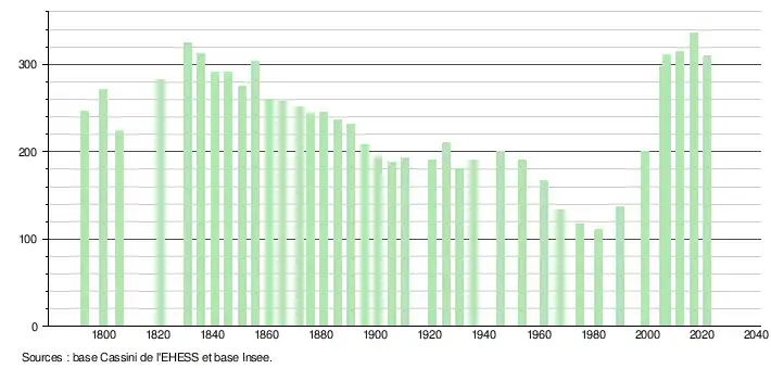 L'évolution du nombre d'habitants est connue à travers les recensements de la population effectués dans la commune depuis 1793. Pour les communes de moins de 10 000 habitants, une enquête de recensement portant sur toute la population est réalisée tous les cinq ans, les populations de référence des années intermédiaires étant quant à elles estimées par interpolation ou extrapolation[21]. Pour la commune, le premier recensement exhaustif entrant dans le cadre du nouveau dispositif a été réalisé en 2007[22].