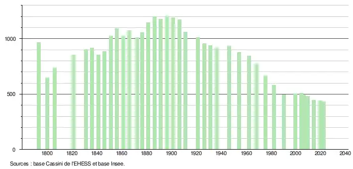 L'évolution du nombre d'habitants est connue à travers les recensements de la population effectués dans la commune depuis 1793. Pour les communes de moins de 10 000 habitants, une enquête de recensement portant sur toute la population est réalisée tous les cinq ans, les populations de référence des années intermédiaires étant quant à elles estimées par interpolation ou extrapolation[31]. Pour la commune, le premier recensement exhaustif entrant dans le cadre du nouveau dispositif a été réalisé en 2004[32].