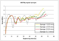 L'avantage des mousses métalliques, qu'elles soient régulières ou stochastiques, est que la réaction est constante quel que soit le sens de l'effort. En effet, les mousses sont homogènes. Elles présentent un plateau de contrainte constant suivant la déformation. Cette déformation peut aller jusqu'à 80 % d'allongement.