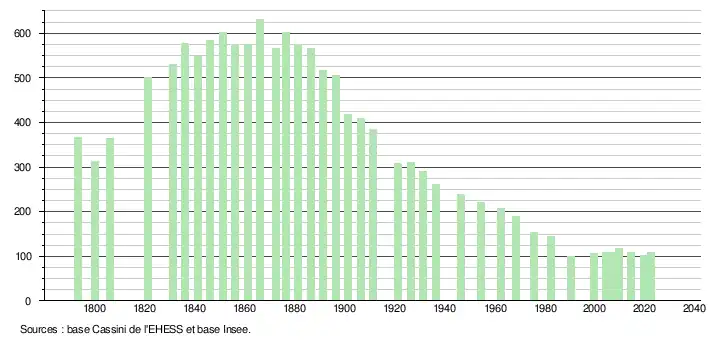 L'évolution du nombre d'habitants est connue à travers les recensements de la population effectués dans la commune depuis 1793. Pour les communes de moins de 10 000 habitants, une enquête de recensement portant sur toute la population est réalisée tous les cinq ans, les populations de référence des années intermédiaires étant quant à elles estimées par interpolation ou extrapolation[13]. Pour la commune, le premier recensement exhaustif entrant dans le cadre du nouveau dispositif a été réalisé en 2004[14].