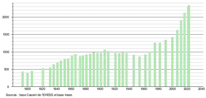 L'évolution du nombre d'habitants est connue à travers les recensements de la population effectués dans la commune depuis 1793. Pour les communes de moins de 10 000 habitants, une enquête de recensement portant sur toute la population est réalisée tous les cinq ans, les populations de référence des années intermédiaires étant quant à elles estimées par interpolation ou extrapolation[23]. Pour la commune, le premier recensement exhaustif entrant dans le cadre du nouveau dispositif a été réalisé en 2006[24].