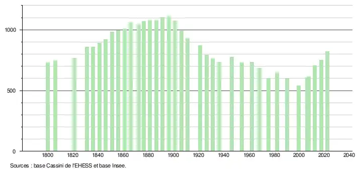 L'évolution du nombre d'habitants est connue à travers les recensements de la population effectués dans la commune depuis 1800. Pour les communes de moins de 10 000 habitants, une enquête de recensement portant sur toute la population est réalisée tous les cinq ans, les populations de référence des années intermédiaires étant quant à elles estimées par interpolation ou extrapolation[26]. Pour la commune, le premier recensement exhaustif entrant dans le cadre du nouveau dispositif a été réalisé en 2007[27].