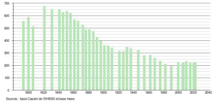 L'évolution du nombre d'habitants est connue à travers les recensements de la population effectués dans la commune depuis 1793. Pour les communes de moins de 10 000 habitants, une enquête de recensement portant sur toute la population est réalisée tous les cinq ans, les populations de référence des années intermédiaires étant quant à elles estimées par interpolation ou extrapolation[24]. Pour la commune, le premier recensement exhaustif entrant dans le cadre du nouveau dispositif a été réalisé en 2005[25].