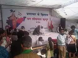 En 2011, Anna Hazare demande au gouvernement de mettre en place un comité composé de représentants du gouvernement et de la société civile afin d'élaborer une loi anti-corruption prévoyant des sanctions plus lourde et une indépendance accrue du Lokpal (ombudsman fédéral) et des Lokayuktas (ombudsmen dans les États)[10]. Après le refus du Premier ministre Manmohan Singh, Hazare entame le à Delhi une grève de la faim et annonce qu'il la poursuivra jusqu'à ce qu'une loi soit adoptée[11]. Il reçoit le soutien de nombreuses personnes, dont 150 qui rejoignent sa grève de la faim[12]. Il refuse toutefois que les politiques le rejoignent ou le soutiennent[13].