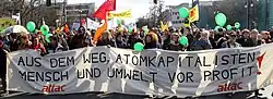 Des centaines de groupes de toute taille, régionaux, nationaux ou internationaux, de toute importance politique – Greenpeace, le WWF, les Amis de la Terre (Friends of the earth), le Réseau Sortir du nucléaire, la Clamshell Alliance (en) (Nouvelle-Angleterre), l'Abalone Alliance (en) (Californie), Stop Golfech (Tarn-et-Garonne)… – s'opposent au développement de l'énergie nucléaire.