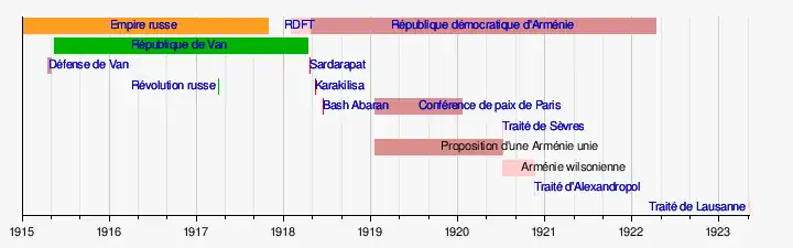 Pendant la Première Guerre mondiale, les Arméniens de l'Empire ottoman sont exterminés par le gouvernement durant le génocide arménien. Selon les estimations, sur la période allant de 1894 à 1923, entre 1 500 000 et 2 000 000 Arméniens sont tués[26]. Après que la décision de mettre en œuvre le génocide fut prise par le ministre de l'Intérieur ottoman Talaat Pacha et exécuté au départ par la Directive 8682 le , des dizaines de milliers d'Arméniens de Russie rejoignent l'armée russe du Caucase au sein des unités de volontaires arméniens avec la promesse du gouvernement russe qu'ils obtiendraient leur autonomie. Jusqu'en 1917, la Russie contrôle une bonne partie des régions de l'Empire ottoman où les Arméniens sont nombreux. Cependant, après la révolution d'Octobre, les troupes russes abandonnent le front du Caucase et laissent les troupes irrégulières arméniennes seules face à l'armée ottomane. Le Conseil national arménien proclame la république d'Arménie le , établissant ainsi un État arménien dans les provinces habitées par les Arméniens dans le Caucase du sud.