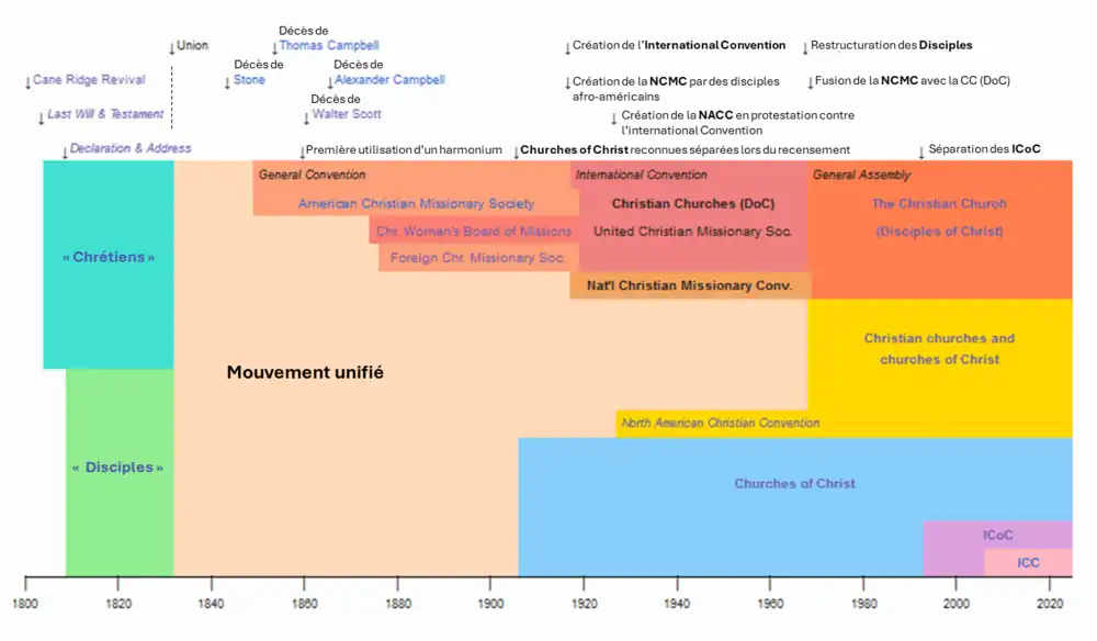 | Église unie du Christ (1957) | Les Disciples officiellement reconnus comme dénomination séparée | Église chrétienne des Disciples du Christ(ECDDC) (1968) | Les églises indépendantes se retirent de l'ECDDC et sont reconnus séparés en 1971 | Christian Churches and Churches of Christ (1971) | Churches of Christ (non-institutional) (c. 1960) | ||||||||||||||||||||||||||||||||||||||||||||||||||||||||||||||||||||||||||||||||