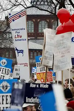Au contraire du Parti démocrate, la position officielle du Parti républicain est pro-vie[8], tout comme celle de la plupart de ses personnalités, par exemple Sarah Palin[9]. Toutefois, il existe dans chaque parti une minorité divergente. Chez les Républicains, l'association Republicans for Choice milite pour l'avortement légal, position partagée par des élus tels que l'ancien gouverneur de Californie Arnold Schwarzenegger. Chez les Démocrates, on trouve à l'inverse l'association Democrats for Life et des élus tels que le sénateur Bob Casey Jr, qui se revendiquent pro-vie.